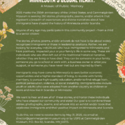 The stories, photos, poems, and/or artwork do not have to be about widely recognized immigrants or those in leadership positions. Rather, we are looking for everyday individuals who have immigrated to Minnesota and have positively impacted your or your family’s life in some way. These are individuals who are often left out of the traditional historical narrative, whether they are living or have died. They can be someone in your family, someone you go to school or work with, a business owner or artist you support, or someone you have never met but are inspired by them.