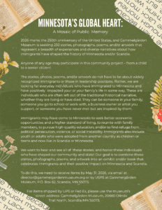 We want to hear and see all of these stories, and honor these individuals who have shaped our community and state! Our goal is to combine these stories, photographs, poems, and artwork into an exhibit and/or book that celebrates immigrants and their positive impact on Minnesota and Scandia.