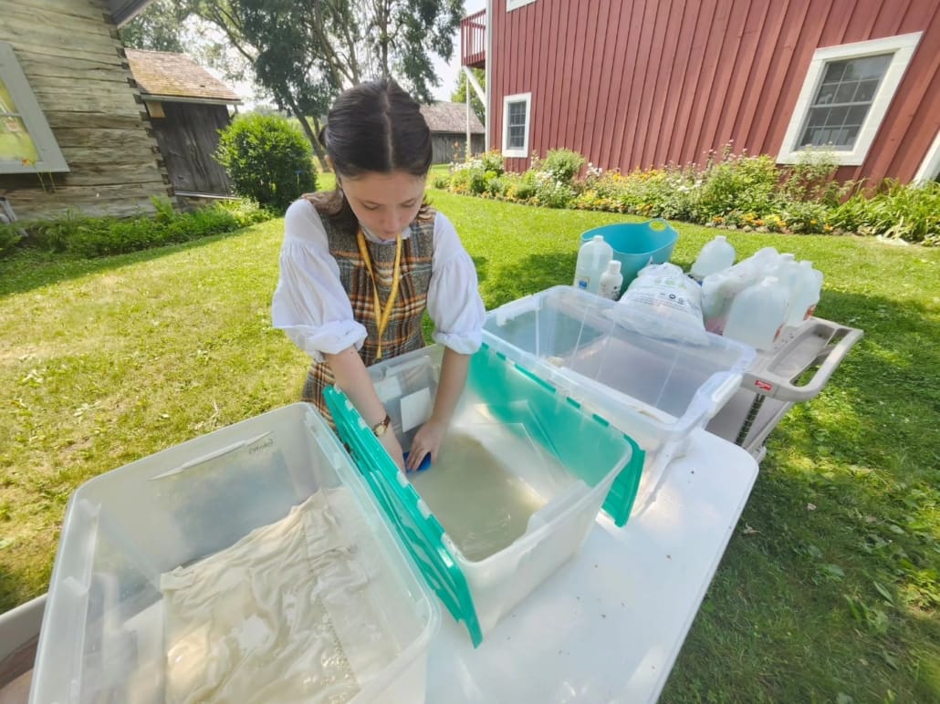 Another significant part of Margot’s internship was cleaning and restoring 45 textiles from the Pastor’s House. This involved an outdoor set-up and four-step washing station, where she gently cleaned textiles with a diluted vinegar bath and Vulpex, a specialty conservation soap.