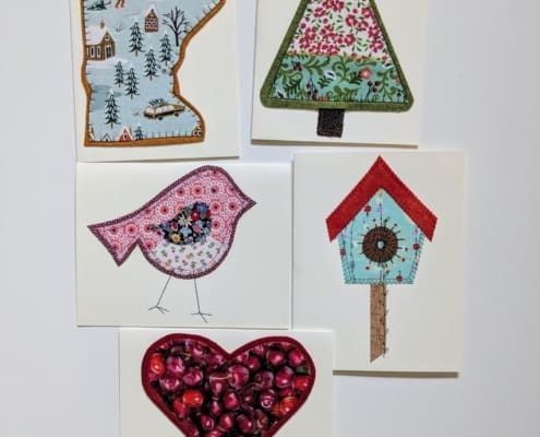 Delight recipients with a unique card for holidays, weddings, birthdays, or any other occasion. Fabric applique is sewn directly onto the paper card. Many embellishments can be added. This fun class will include many tips, ideas, and even patterns…